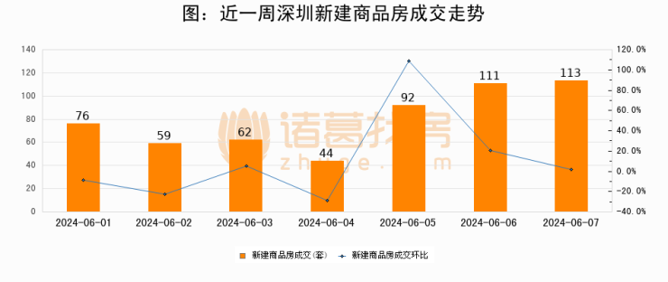 根据深圳市住房和城乡建设局数据显示,2024年06月07日深圳新建商品房成交113套,较昨日增加2套,环比上涨1.8%。近一周深圳新建商品房日均成交80套。06月07日单日成交113套,高于近一周平均水平41.3%。