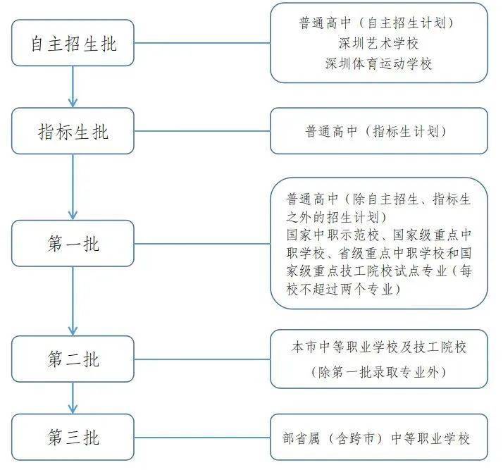 我市高中阶段学校录取共分五个批次,按照以下顺序依次进行: