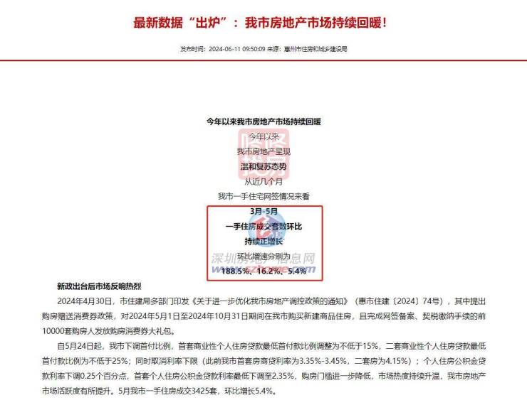 据惠州市住房和城乡建设局统计数据显示,从3月份开始,楼市一手住宅网签持续上涨势头显著,过去三个月环比增速分别为:188.5%、16.2%、5.4%,在刚刚过去的5月份交易规模已涨至3425套。