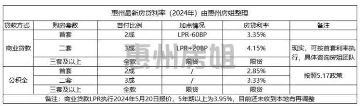 惠州住建官方的消息显示,自5月24日起,下调首付比例,首套商业性个人住房贷款最低首付款比例调整为不低于15%;二套商业性个人住房贷款最低首付款比例为不低于25%。