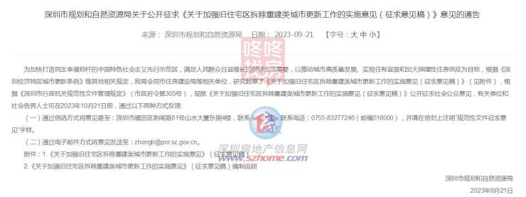 9月21日,深圳市规划和自然资源局发布《关于加强旧住宅区拆除重建类城市更新工作的实施意见(征求意见稿)》,目前正在意见征求中。