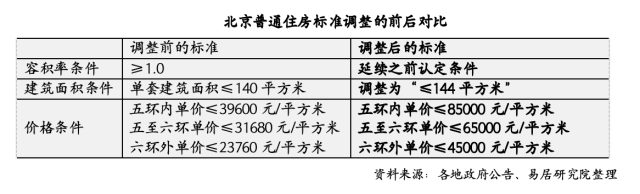 北京普通住房的标准也迎来调整,主要是在建筑面积条件、价格条件方面作出变动,包括单套建筑面积由140平方米以下调整为144平方米以下,价格标准取消了总价段限制,五环内成交单价上限由39600元/平方米提升至85000元/平方米,提升了1.15倍;五-六环成交单价上限由31680元/平方米提升至65000元/平方米,提升了1.05倍;六环外成交单价上限由23760元/平方米提升至45000元/平方米,提升了89%。按照北京市住建委数据,政策调整后北京全市普宅占比提高至七成左右,将有更多家庭能够享受住房转让时的增值税优惠政策。