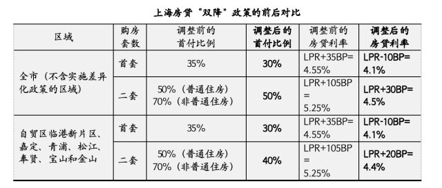 此次,上海的住房信贷政策也有所调整。上海新政提及,上海首套房首付比例调整为不低于30%。二套房在自贸区临港新片区以及嘉定、青浦、松江、奉贤、宝山、金山6个行政区全域实行差异化政策,最低首付款比例调整为不低于40%。