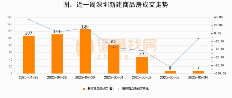 根据深圳市住房和城乡建设局数据显示,2025年05月04日深圳新建商品房成交7套,较昨日减少1套,环比下降12.5%