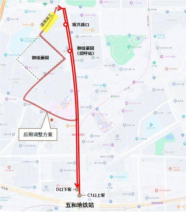 龙岗区坂田御珑豪园⇋地铁5号线五和站,其中地铁D口为下客点,C1口为上客点。
