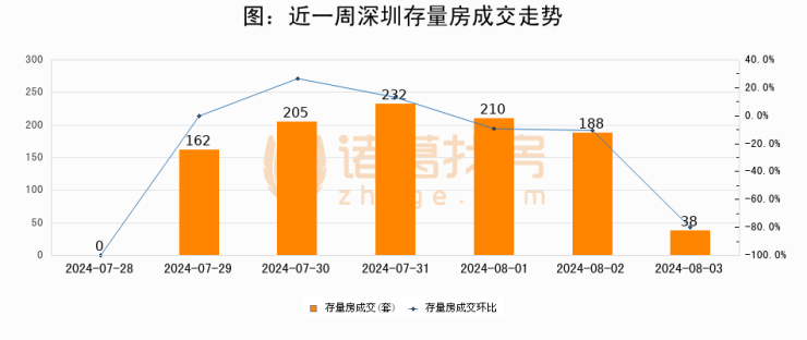 从存量房来看,2024年08月03日深圳存量房单日成交38套,比昨日减少150套,环比下降79.8%。从近一周存量房成交来看,深圳存量房日均成交套数为147套,08月03日单日成交38套,低于近一周平均水平74.1%。