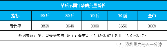 历年来,春节前后成交差异显著。今年春节后成交增长率尤为突出,除了节后市民返深、外来求职人群增加,还叠加二手住宅参考价新政出台等因素,衍生新租、换租需求。其中,90后相比节前增长383%,增速先进其他年龄段,同时超越全市水平(366%)。