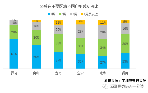 90后对一房及二房需求较大。一房成交占比较高的是罗湖(61%)、南山(50%);两房户型除罗湖外,其余区域成交占比均超过30%;三房户型龙华、宝安、龙岗均超20%;四房及以上仅龙岗、龙华占比超过10%。