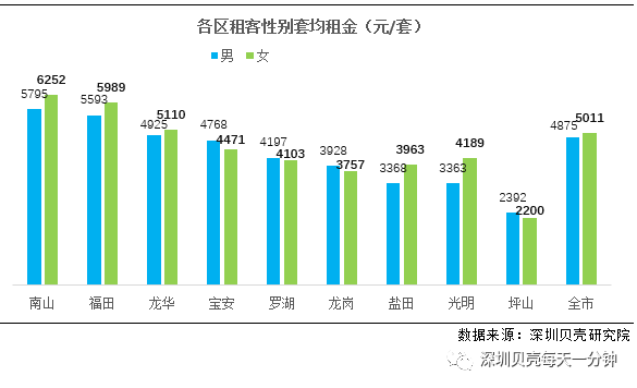 深圳贝壳研究院数据显示,90后女性租客套均租金5011元,男性套均租金4875元。其中,南山、福田、龙华、盐田、光明五区女性租客套均租金高于男性。