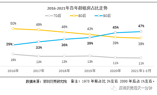 随着城市经济、都市圈的发展,深圳吸引着众多年轻人,租房需求旺盛。深圳贝壳研究院数据显示,年轻人向来是租房市场主流,其中2020年起90后租赁占比已超越80后,晋升为租房主力军。