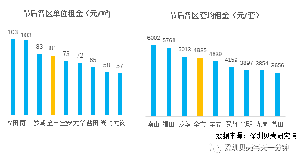 套均租金方面,南山套均租金为6002元、福田5761元、龙华5013元,这三区均先进全市套均租金水平(4935元),宝安、罗湖在4000元以上,光明、龙岗、盐田则低于4000元。