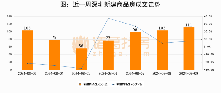 根据深圳市住房和城乡建设局数据显示,2024年08月09日深圳新建商品房成交111套,较昨日增加8套,环比上涨7.8%