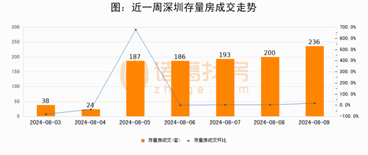 从存量房来看,2024年08月09日深圳存量房单日成交236套,比昨日增加36套,环比上涨18%。从近一周存量房成交来看,深圳存量房日均成交套数为152套,08月09日单日成交236套,高于近一周平均水平55.3%。