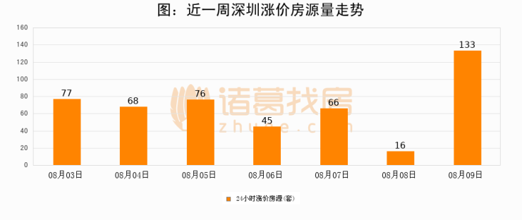 根据诸葛找房数据显示,深圳24小时涨价房源量为133套,较08月08日增加117套,环比上涨731.2%。与此同时,涨价房源占比小幅扩大,业主信心有所提升。