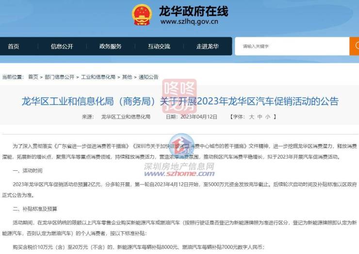 近日,龙华区工业和信息化局(商务局)发布了开展2023年龙华区汽车促销活动的公告,为进一步刺激消费,提振汽车消费市场,龙华区推出了2023年汽车促销活动。本次活动总资金预算2亿元,分多轮开展。第一轮自4月12日开始,至5000万元资金发放完毕截止。
