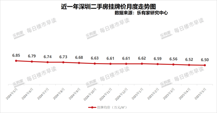 根据乐有家门店挂牌数据计算,5月深圳二手住宅挂牌均价为6.50万元/㎡,环比小幅下滑0.3%,业主挂牌价整体维稳。