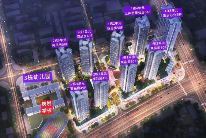 云璞花园共由9栋超高层建筑组成,其中1栋1/2/3单元商品房50F,1栋4单元公共租赁住房54F,1栋5单元办公酒店38F,2栋1/2/4单元商品房49F,2栋3单元商品房50F,3栋是1所9班幼儿园。