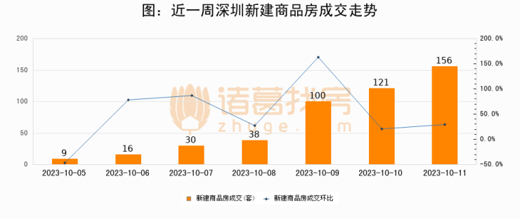 根据深圳市住房和城乡建设局数据显示,2023年10月11日深圳新建商品房成交156套,较昨日增加35套,环比上涨28.9%