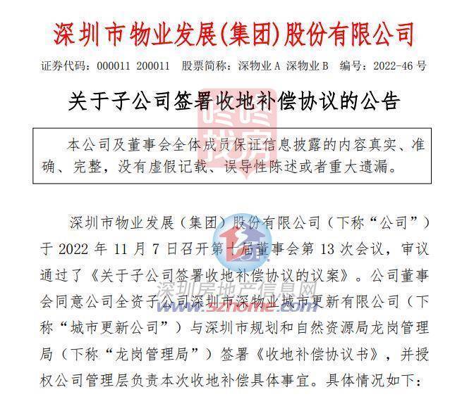 11月7日,深圳市物业发展(集团)股份有限公司发布关于子公司签署收地补偿协议的公告。