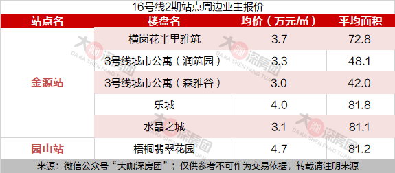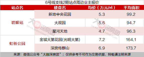 其中碧眼站的新地中央花园目前挂盘均价5.3万元/㎡、大观园挂盘均价5.6万元/㎡、星河天地均价4.7万元/㎡。