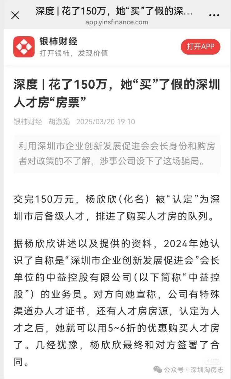 涉事公司中益控股,宣称能通过“特殊渠道”办理人才证书、获取优质人才房房源,主要还是利用购房者对人才房政策的不了解,同时打着深圳市企业创新发展促进会会长单位的旗号,削弱购房者的警惕。
