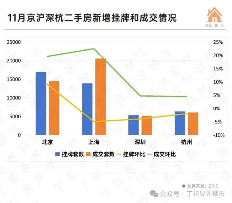 聚焦北京、上海、深圳、杭州等核心一二线城市,从CRIC监测的四城新增挂牌套数来看,11月四城新增挂牌总量与上月基本持平,环比微增1%,同比下降7%。上个月是同环比齐跌。