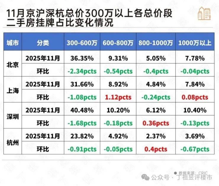 数据显示,京沪深杭300万-600万元刚改中改总价段新增挂牌占比出现了稳步回落,其中北京该价格段挂牌占比降幅最明显,环比下降2.34个百分点。