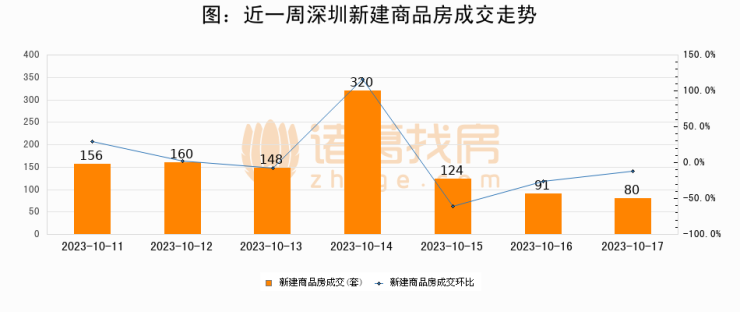 根据深圳市住房和城乡建设局数据显示,2023年10月17日深圳新建商品房成交80套,较昨日减少11套,环比下降12.1%