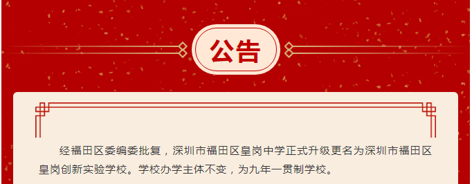 官宣升级,福田皇岗中学更名为皇岗创新实验学校!