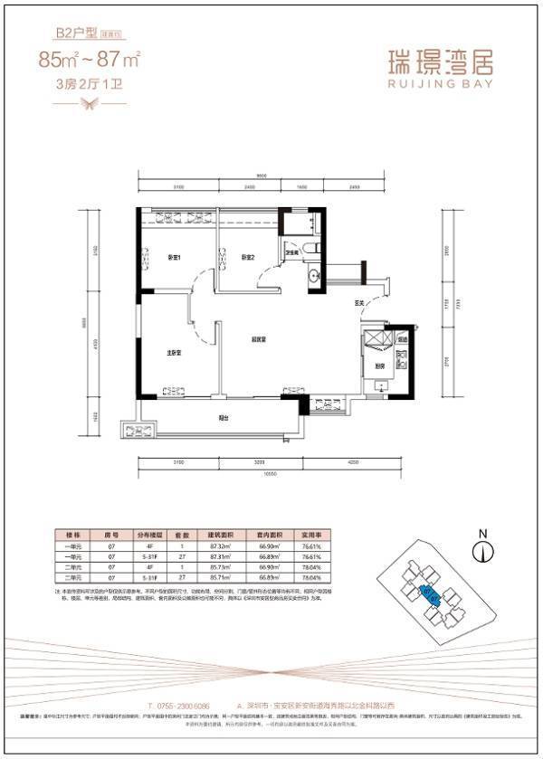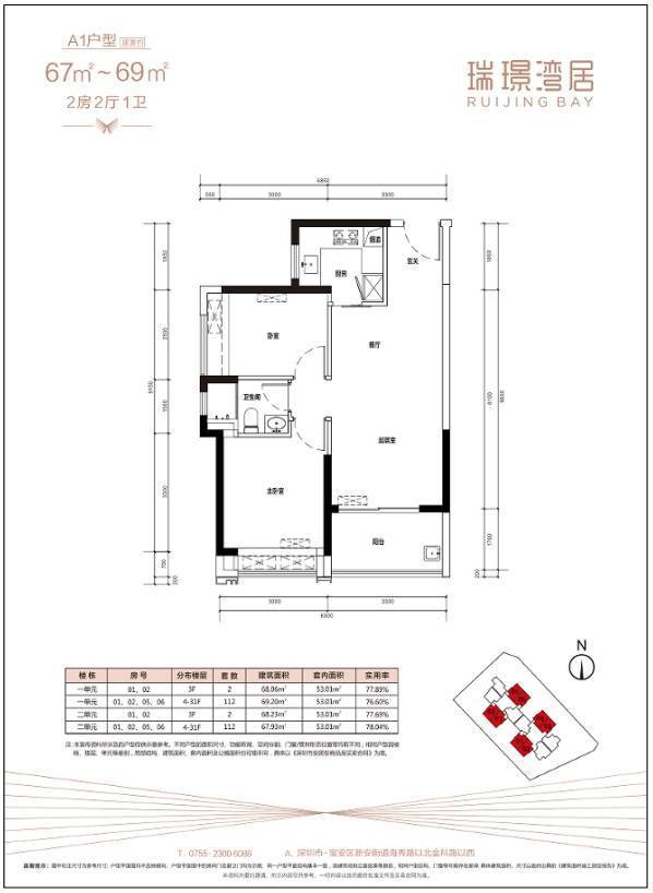 两房共有3种户型,分别为A1/A2/A3户型,全部为竖厅格局,得房率在78%左右。