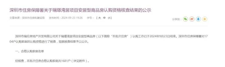 9月23日,深圳市住房和建设局发布了瑞璟湾居项目安居型商品房认购资格核查结果。