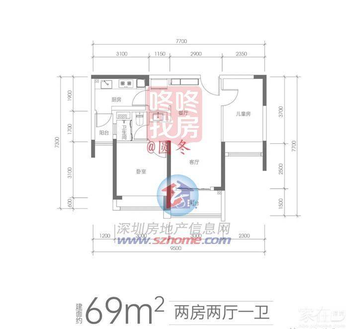 69平2房1卫,比较亮点的是,69平有个双阳台,除了客厅有个阳台外,厨房有个小阳台。