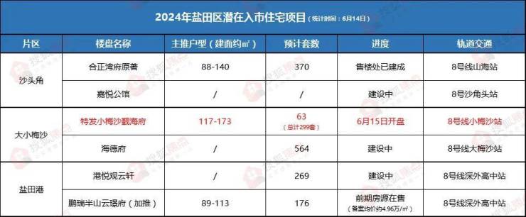 近两年,盐田的新盘供应不是很大,在2024年,盐田预计有6盘入市,除了特发小梅沙觐海广场计划6月15日开盘外,其他项目暂未释放入市计划。