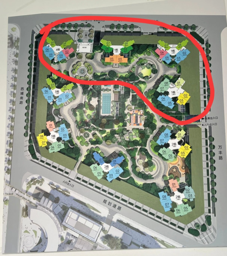 项目占面约6万㎡,总建面约10.4万㎡,容积率非常低,仅1.75。项目规划6栋建筑,包括3栋住宅,2栋别墅,1栋办公,其中住宅层高22-23层,2梯2户/2梯3户设计。