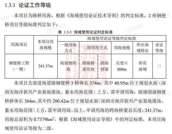 用海概况:二期工程申请用海面积1.2701公顷,含北部进场道路钢便桥1面积0.6106公顷,沙福涌钢便桥面积0.6595公顷。用海方式为跨海桥梁,用海类型为交通运输用海中的路桥用海,用海性质为公益性,申请用海期限为3年。项目不占用人工岸线。