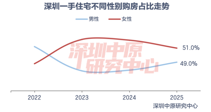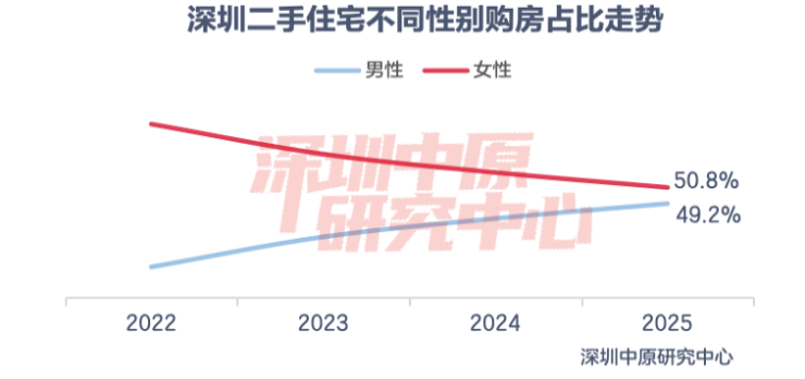 日前,深圳中原研究院发布了2025年深圳楼市的用户画像,具体来看,2025年深圳二手住宅置业者中女性占比50.8%,较2024年下滑1.4%,相较于2022年占比下滑6.2%。