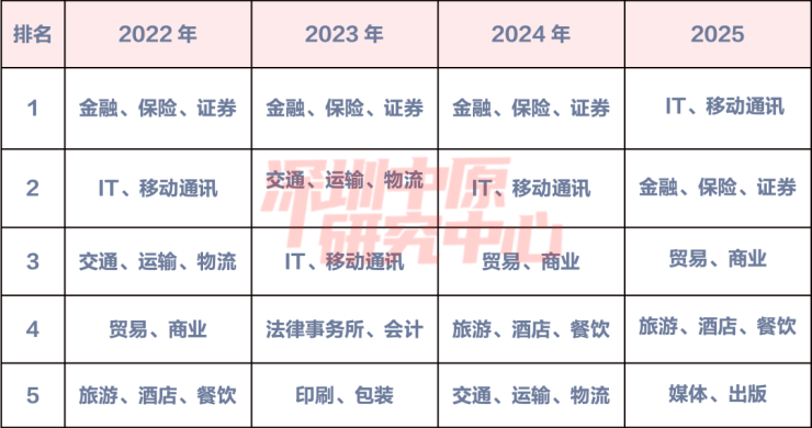 2025年IT、移动通讯行业购房者以略微优势反超金融、保险、证券行业占据第一;金融、保险、证券行业位居第二;贸易、商业行业连续两年位居第三;媒体、出版行业2022年后首进前五。