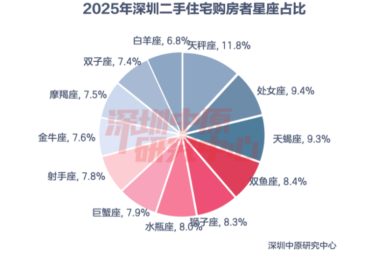 2025年二手置业者中天秤座成交占比最大,为11.8%;其次是处女座、天蝎座。二手置业者中白羊座买家最少,仅有6.8%。