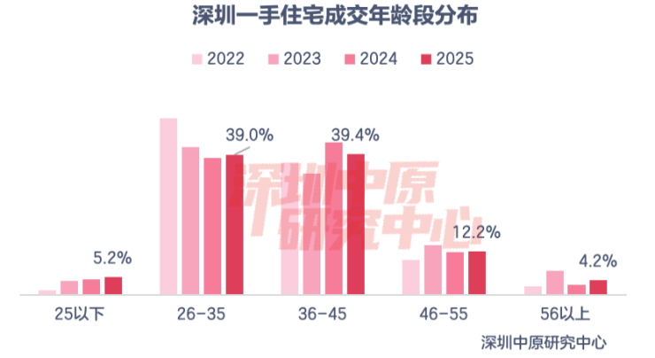 2025年一手置业者中,36-45岁年龄段为购房主力,占比39.4%,连续两年占据成交第一。26-35岁占比39.0%位居第二,与去年相比上升了0.8%。46-55岁占比12.2%,与去年相比上升了0.2%。