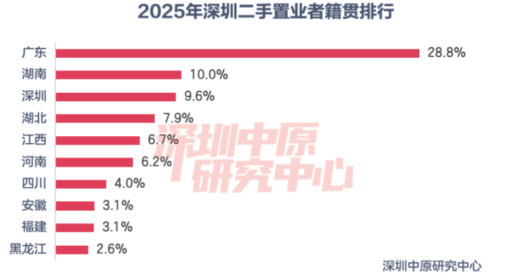 2025年二手置业者中来自广东(不包括深圳)的置业者成交占比遥遥领先,为28.8%。湖南和深圳位居第二和第三,成交占比分别为10.0%、9.6%。