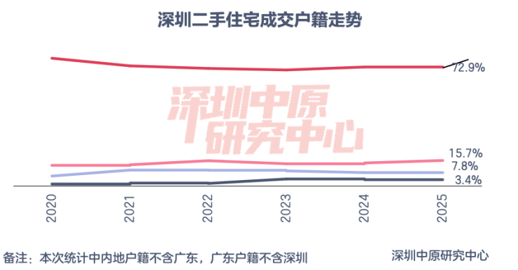 2025年二手置业者中深户购房占比为72.9%,较去年减少0.6%。广东省其他户籍置业者购房占比为7.8%,较去年下滑0.4%。内地置业者购房占比15.7%,较去年上升1.5%。香港置业者购房占比下滑0.5%至3.4%。