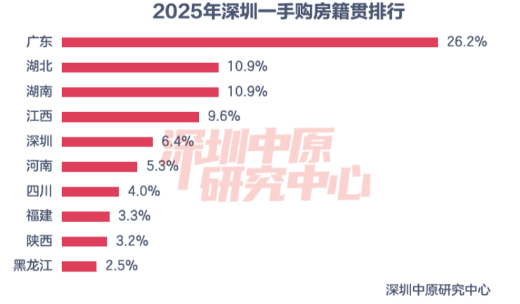 2025年一手置业者中来自广东(不包括深圳)的置业者占据绝对优势,占比为26.2%。湖北、湖南的一手置业者位居二三位,成交占比均为10.9%,深圳本地置业者占比6.4%位居第五。
