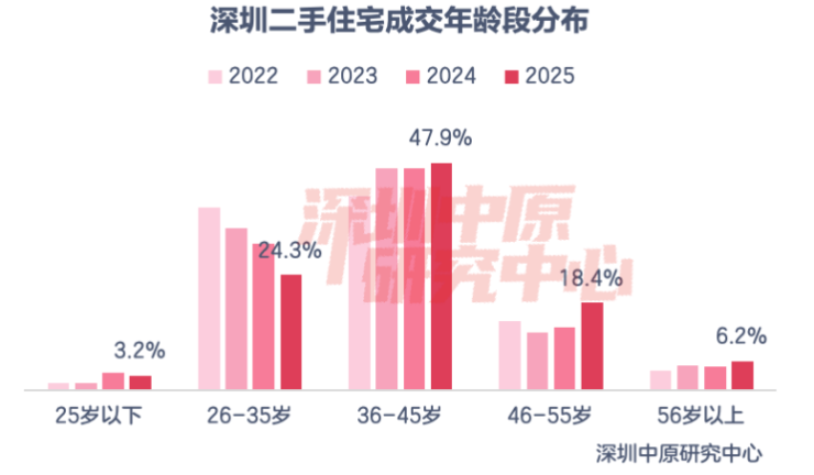 2025年二手置业者中,35岁以下年龄段占比持续下滑。购房主力为36-45岁的置业者,占比47.9%,较去年上升1.0%。46-55岁占比18.4%,上升5.0%。