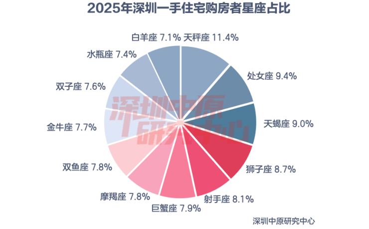 2025年一手置业者中天秤座成交占比最大,为11.4%;其次为处女座、天蝎座。一手置业者中白羊座买家最少,仅有7.1%。