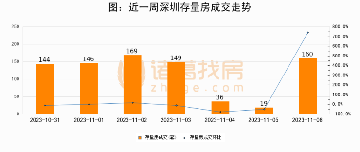 从存量房来看,2023年11月06日深圳存量房单日成交160套,比昨日增加141套,环比上涨742.1%。从近一周存量房成交来看,深圳存量房日均成交套数为117套,11月06日单日成交160套,高于近一周平均水平36.8%。