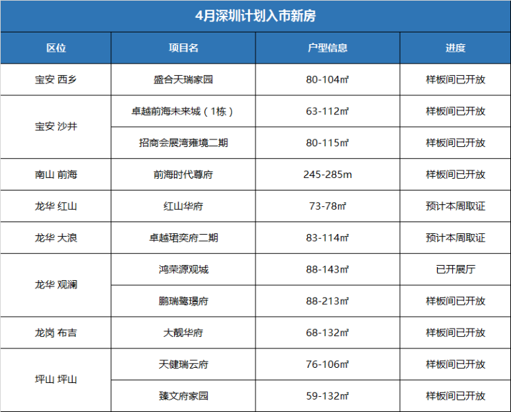 从统计的楼盘来看,4月计划入市新房不乏昔日红盘,像沙井的卓越前海未来城、南山的前海时代尊府、龙华的卓越珺奕府等,这些项目前期产品都较为畅销,有部分甚至创下过“日光”佳绩。