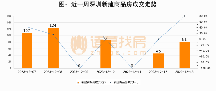 根据深圳市住房和城乡建设局数据显示,2023年12月13日深圳新建商品房成交81套,较昨日增加36套,环比上涨80%。近一周深圳新建商品房日均成交64套。12月13日单日成交81套,高于近一周平均水平26.6%。