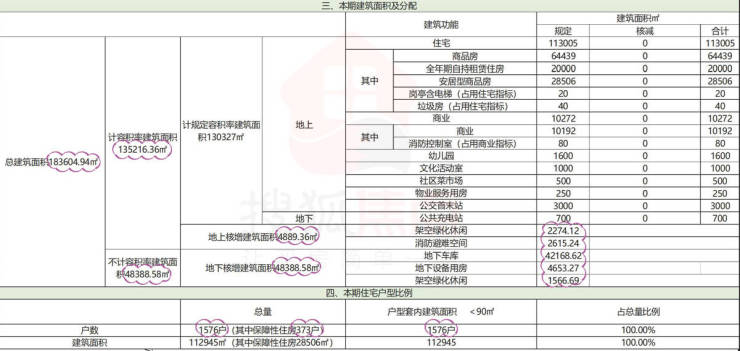 雍山郡花园占地面积24989㎡,总建面约183605㎡,计容积率建面约130327㎡,其中住宅113005㎡,包含商品房、安居房、全年期自持租赁住房;商业约10272㎡,共规划1576户,其中可售商品房约750套,安居房373套,户型均为套内建筑面积<90㎡,车位共1377辆。
