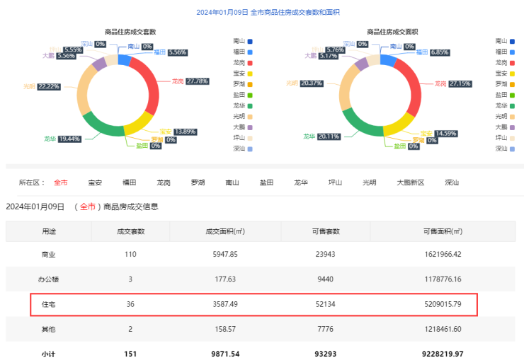 2024年1月9日新房住宅共网签36套。宝安5套;福田2套;龙岗10套;罗湖0套;南山0套;盐田0套;龙华7套;坪山2套;光明8套;大鹏2套;深汕0套。