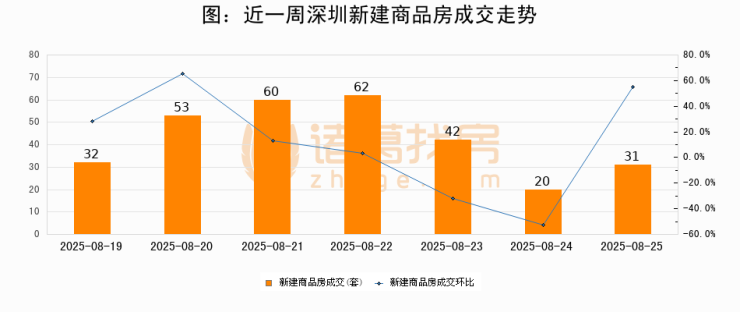 根据深圳市住房和城乡建设局数据显示,2025年08月25日深圳新建商品房成交31套,较昨日增加11套,环比上涨55%